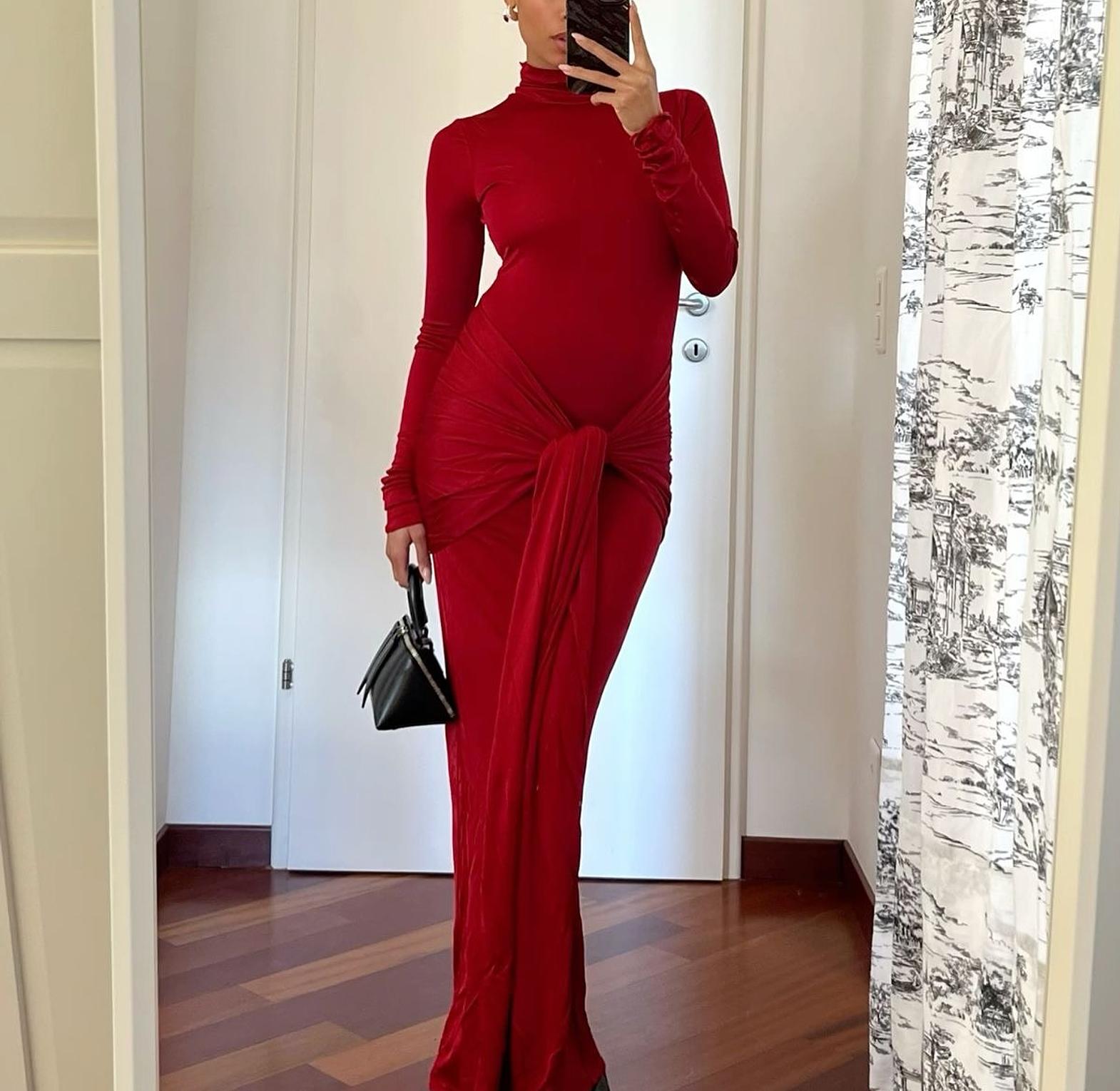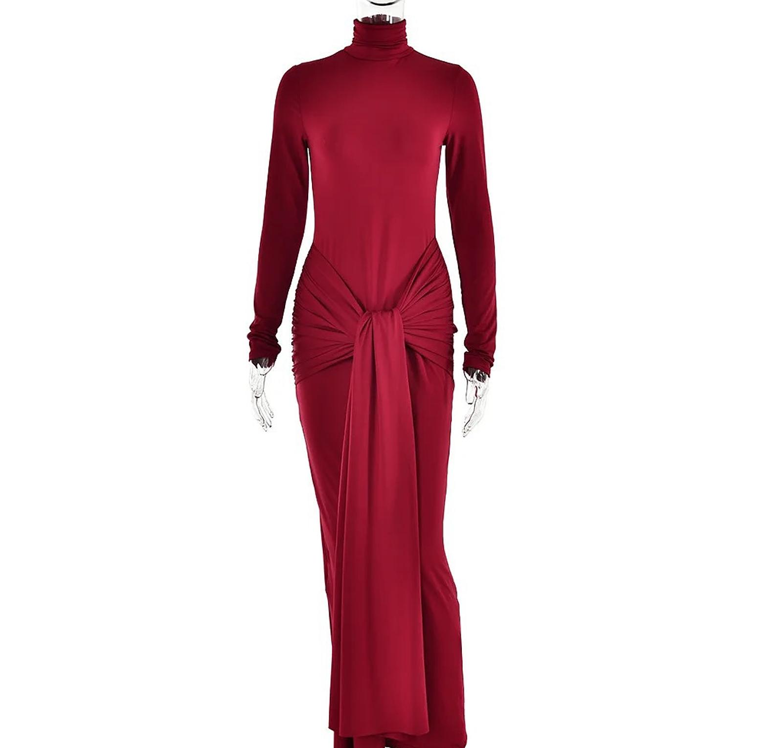 Exude timeless elegance in this sophisticated maxi dress, designed with a chic high turtle neckline and a wrap-around bottom that enhances your silhouette. Perfect for formal occasions or special evenings, it offers a blend of comfort and class. Available in cherry red and dark brown, and in sizes S-L, this dress ensures you make a statement wherever you go.