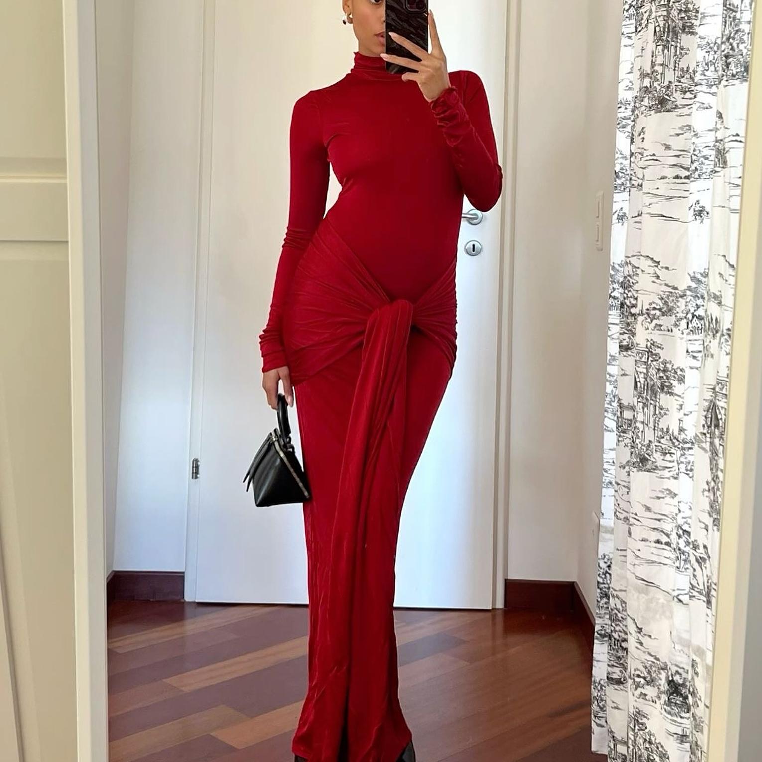 Exude timeless elegance in this sophisticated maxi dress, designed with a chic high turtle neckline and a wrap-around bottom that enhances your silhouette. Perfect for formal occasions or special evenings, it offers a blend of comfort and class. Available in cherry red and dark brown, and in sizes S-L, this dress ensures you make a statement wherever you go.